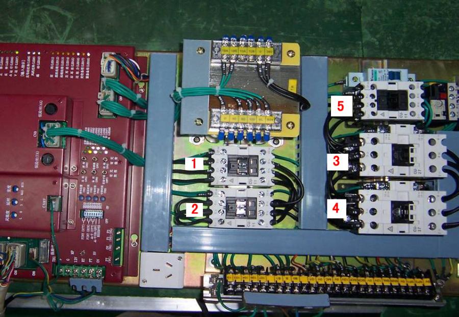 上圖中,1#、2#接觸器主要用于控制電機星-三角啟動,3#接觸器主要用于控制電機正轉起動(即織機正常起動),4#接觸器主要用于控制電機反轉點動(即織起正常起動前絲線位置的調整),5#接觸器+熱繼電器主要用于控制風機。